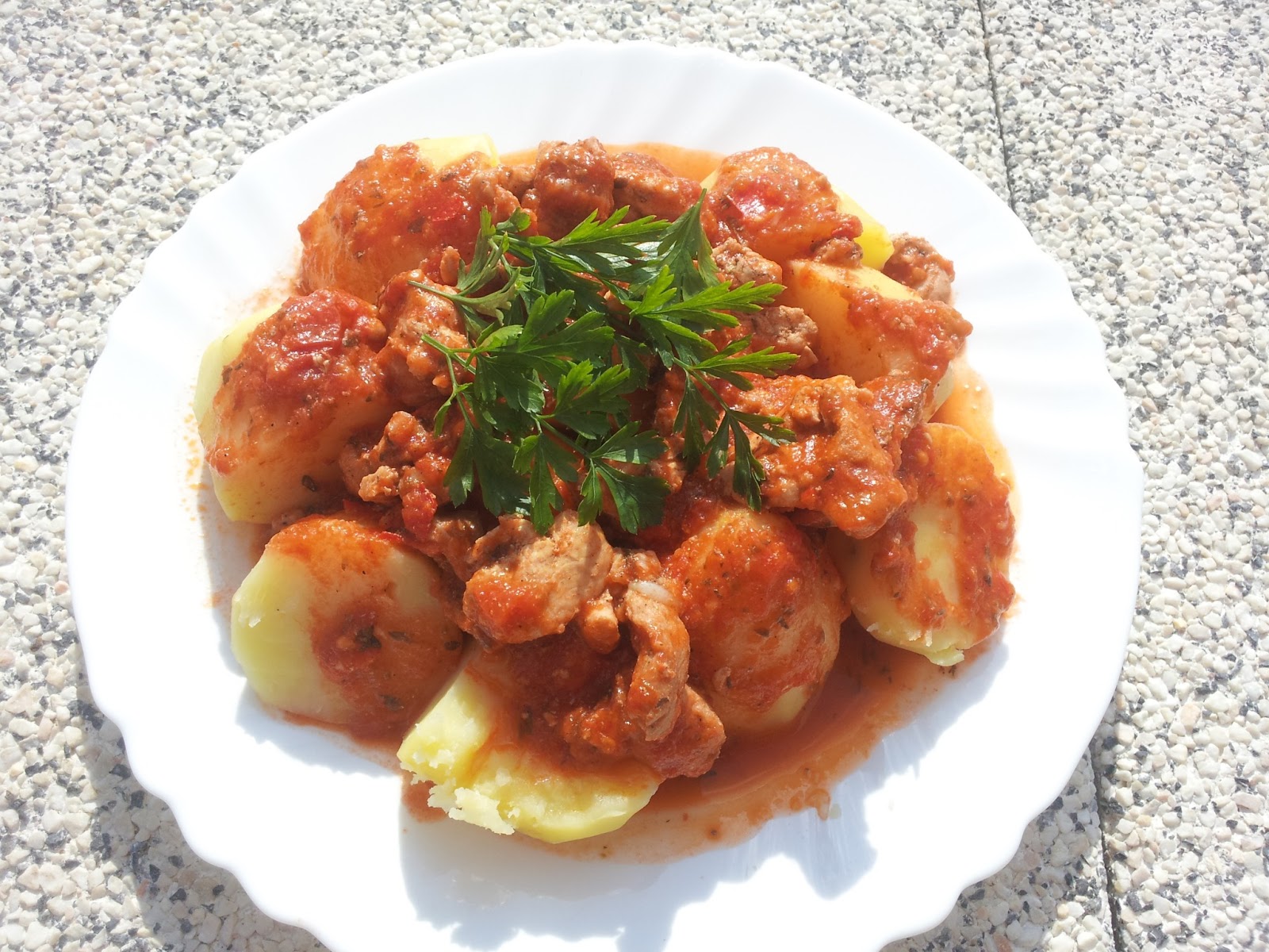 Mięso przyprawiamy solą, pieprzem, tymiankiem, czosnkiem oraz chili i smażymy na patelni. Gdy mięso się zetnie dodajemy pulpę pomidorową i sos chili, doprawiamy do smaku. Całość dusimy min. 30 min. Podajemy z ziemniakami, na wierzchu układając natkę pietruszki.